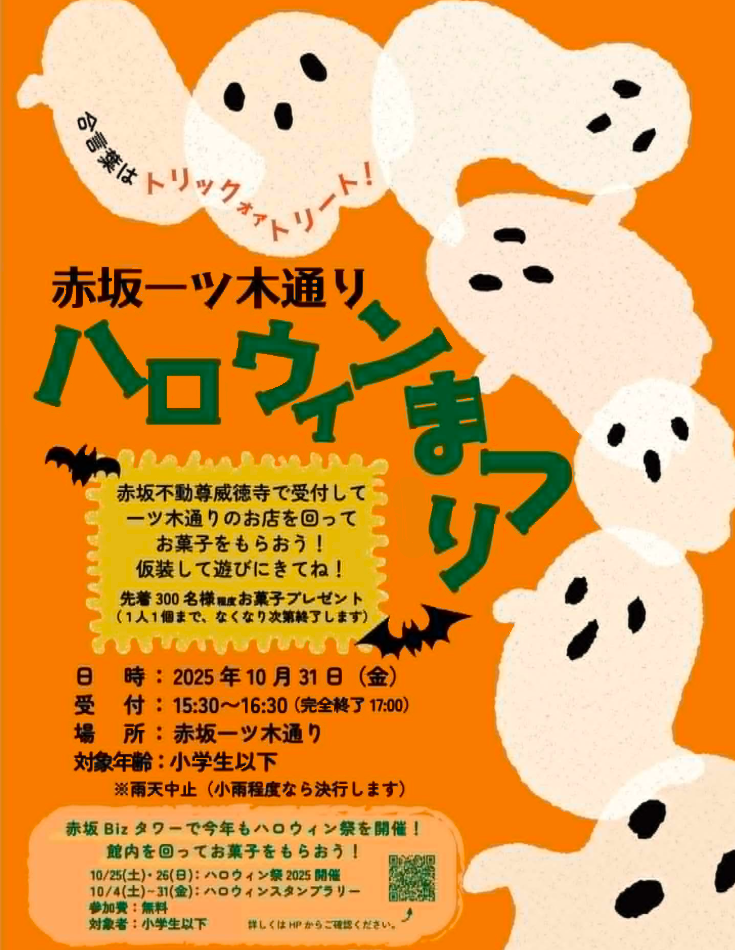 当店がございます【赤坂一ツ木通り商店街】にて、ハロウィンまつりが開催されます。赤坂不動尊威徳寺で受付をしたら、一ツ木通り商店街のお店を回ってお菓子もらいましょう🍬小学生以下のお子様 先着300名様にご準備しています。