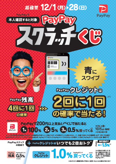 ・PayPayクレジットやPayPayカードでのお支払いなどで、スクラッチの当選確率をアップすることができます。詳しくは下記キャンペーンサイトをご確認下さい。